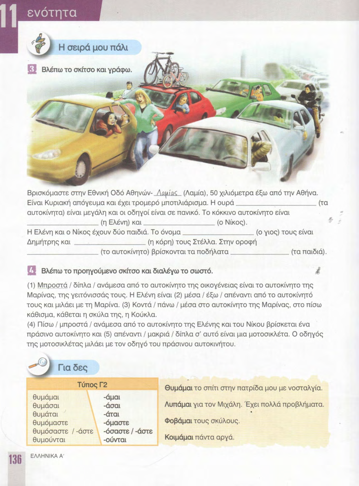 Είναι Κυριακή απόγευμα και έχει τρομερό μποτιλιάρισμα. Η ουρά ____ (τα αυτοκίνητα) είναι μεγάλη και οι οδηγοί είναι σε πανικό. Το κόκκινο αυτοκίνητο είναι ____ (η Ελένη) και ____ (ο Νίκος).
