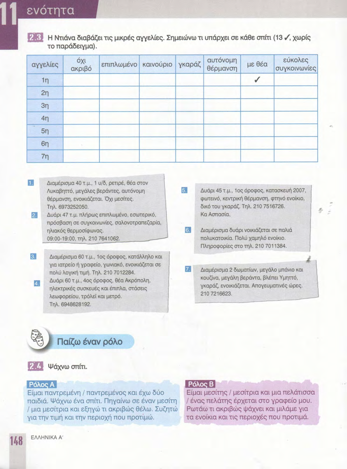 Η Ντιάνα διαβάζει τις μικρές αγγελίες. Σημειώνω τι υπάρχει σε κάθε σπίτι (13 ✓, χωρίς το παράδειγμα).